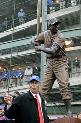 Team History Displays. In front of the home plate marquee is a statue of Ernie Banks. Outside the center field bleacher entrance is one of Ron Santo. At the right field gate is one of Harry Caray, who broadcast for the St. Louis Cardinals (1945-69), the Oakland Athletics (1970), the White Sox (1971-81) and the Cubs (1982-97).